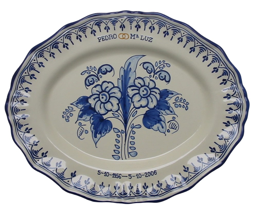 Bandeja de cerámica de Talavera artesanal de 34x27cm personalizada para regalo de aniversario de bodas, se lo hacemos con la inscripción, medidas y decoración que desee.