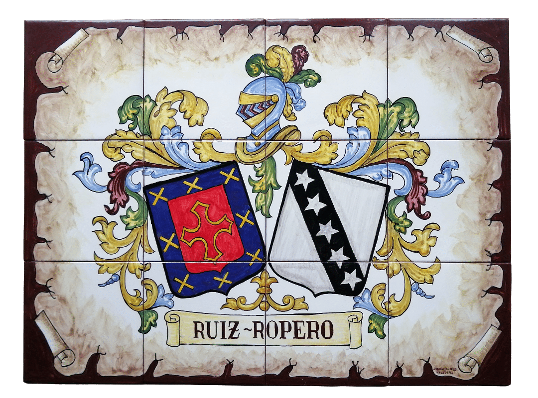 Cuadro heráldico de cerámica con los escudos de los apellidos con decoración pergamino de 45x60cm realizado en 12 azulejos de 15x15cm , se lo hacemos con los apellidos, decoración y medidas que desee.