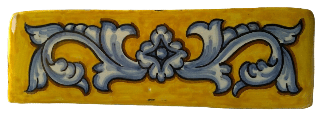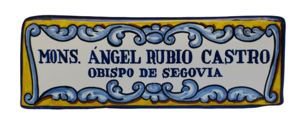 Letrero de cerámica de Talavera de sobremesa identificativo con nombre pintado a mano de 20cm de ancho por 7cm de altura, se lo hacemos con la inscripción que desee.