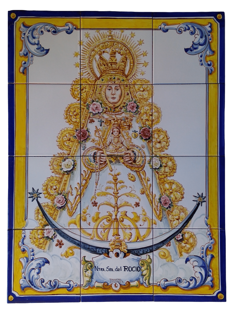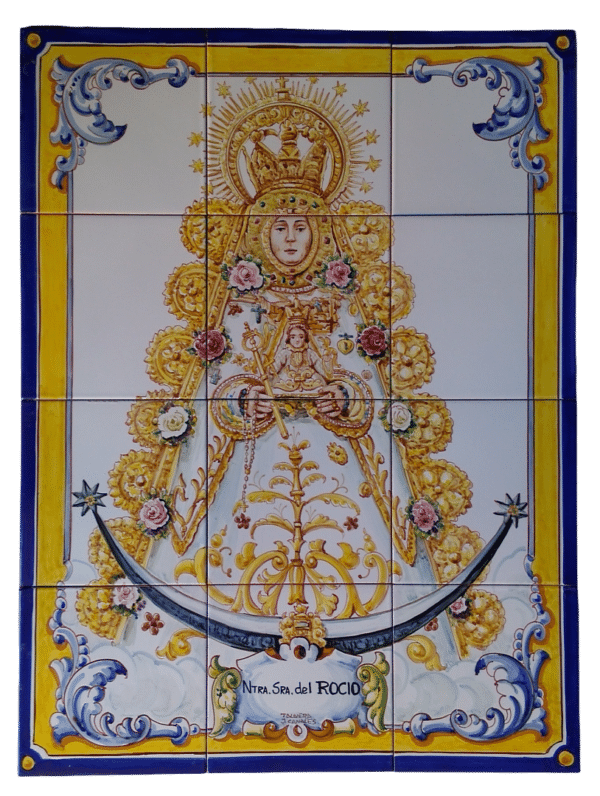 Retablo cerámico religioso con la imagen de la Virgen del Roció pintado a mano totalmente artesanal de 45x60cm realizado en 12 azulejos de 15x15cm en cerámica de Talavera, se lo hacemos con la imagen, medidas y decoración que desee. (Consultar precio según la imagen, decoración y medidas).