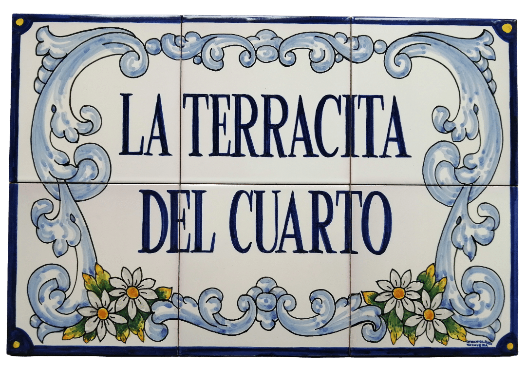 Rotulo personalizado en cerámica de Talavera pintado a mano de 30x45cm realizado en 6 azulejos de 15x15cm, Se hace con las medidas, inscripción y decoración que desee.