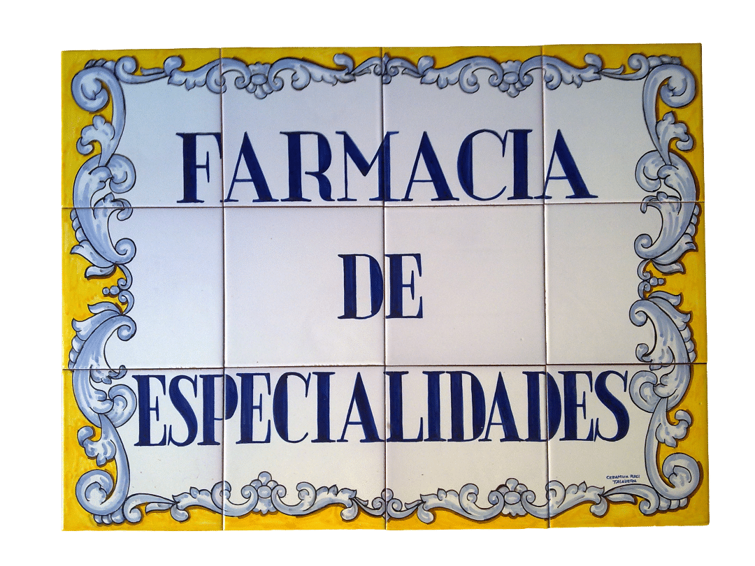 Rotulo de cerámica de Talavera personalizado artesanal para farmacia de 45x60cm realizado en 12 azulejos de 15x15cm , se hace con la inscripción, medidas y decoración que desee.